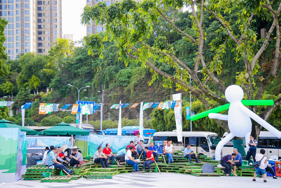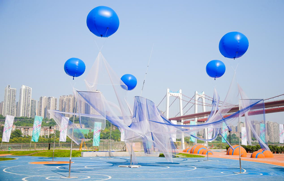 除了峰会部分,AIM国际设计竞赛也向广义设计设计师们发出策展邀请,在2021长江文化艺术周主会场九龙外滩广场,展出了3位资深AIMer的策展作品。分别是DA!建筑设计事务所策划设计的“引力的影子”艺术装置、十作设计带来的“新山城棒棒军计划”互动装置、设计师毛卯的“山城”主题作品展。