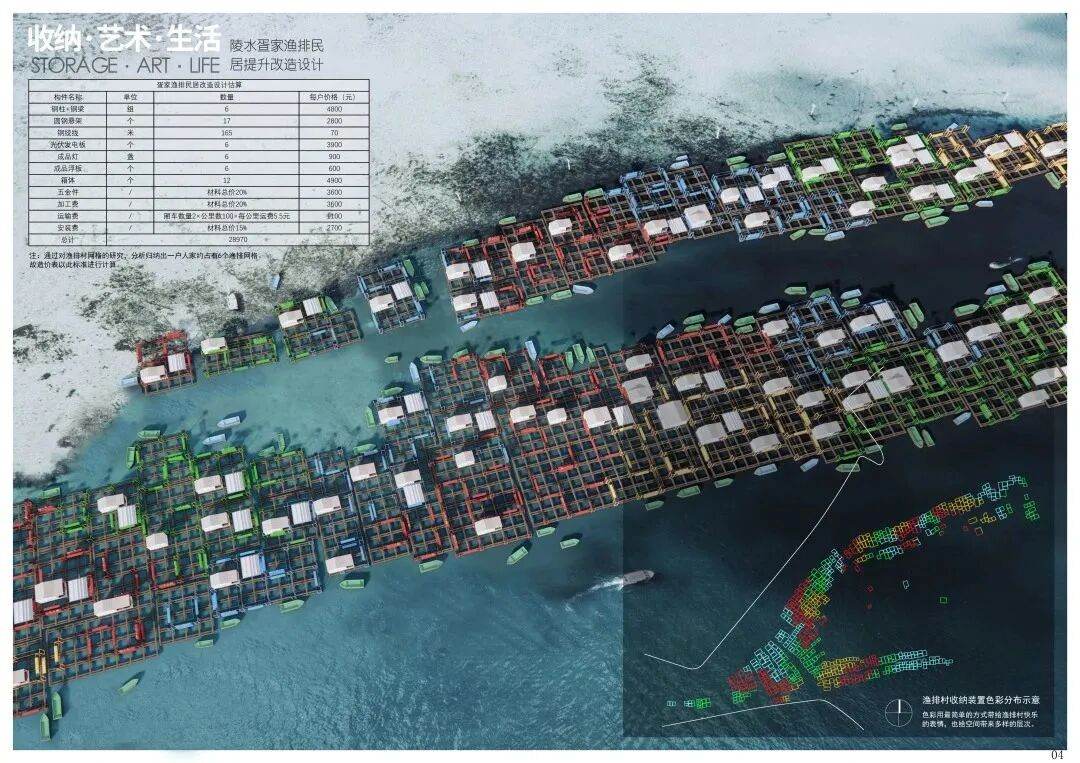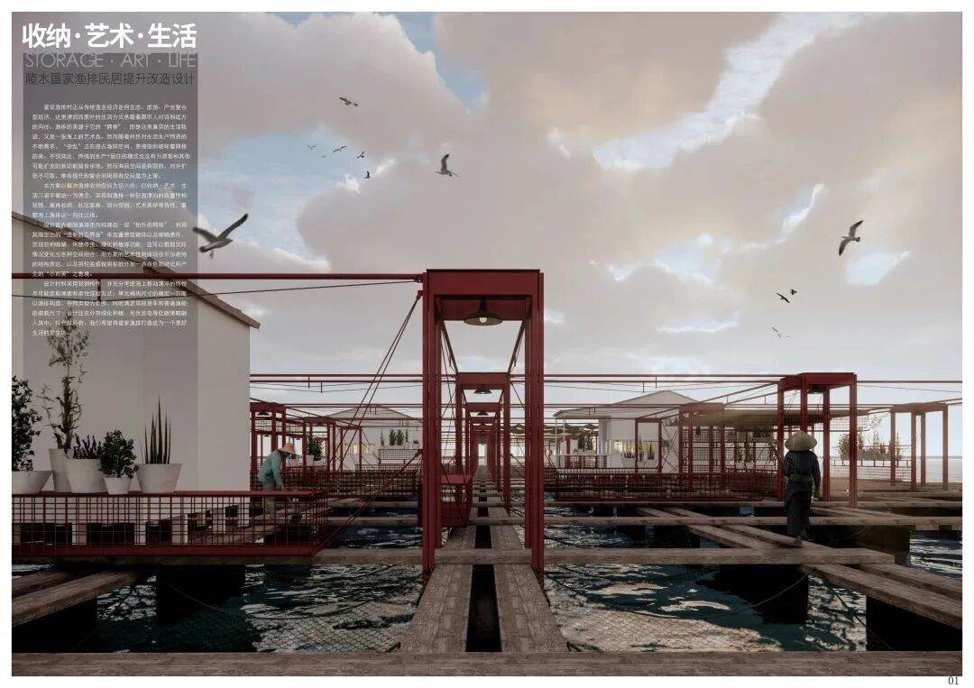 本案以解决渔排收纳空间为切入点,以收纳·艺术·生活三者平衡统一为理念,采用轻盈漂泊的装置性构筑物,兼具收纳、社区家具、划分空间、艺术美学等特性,重塑海上渔排这一向往之地。