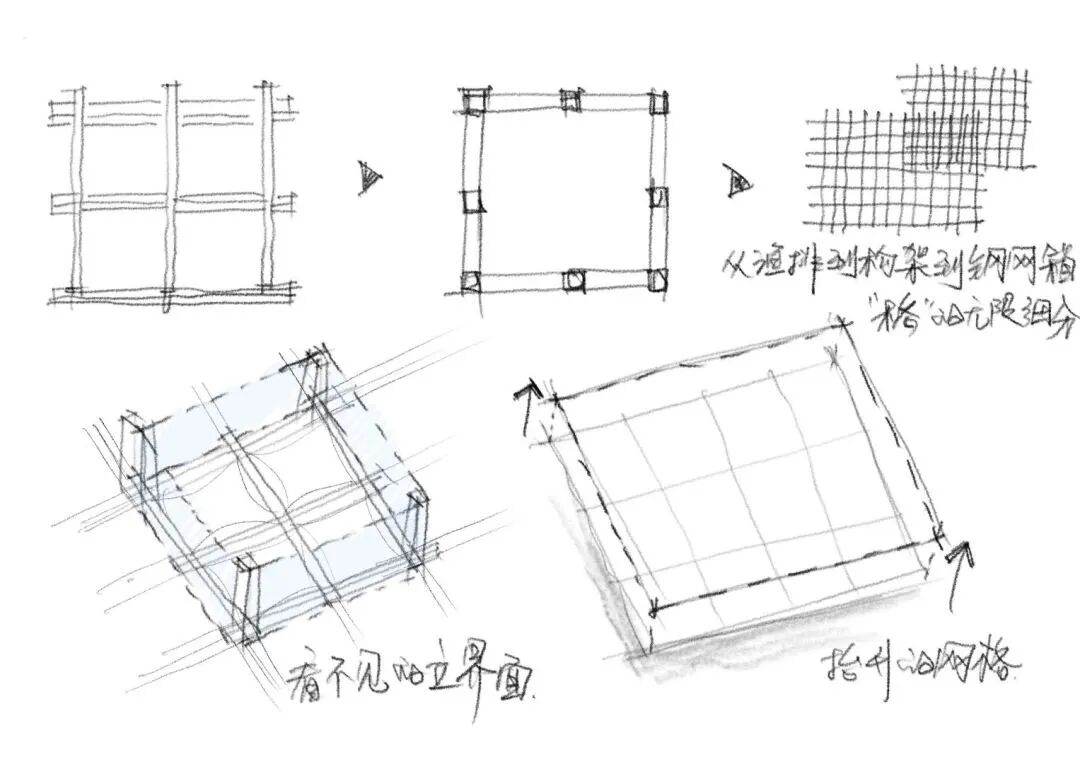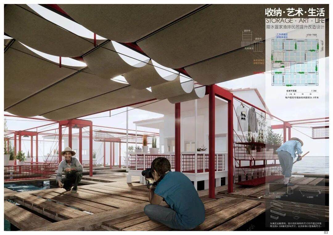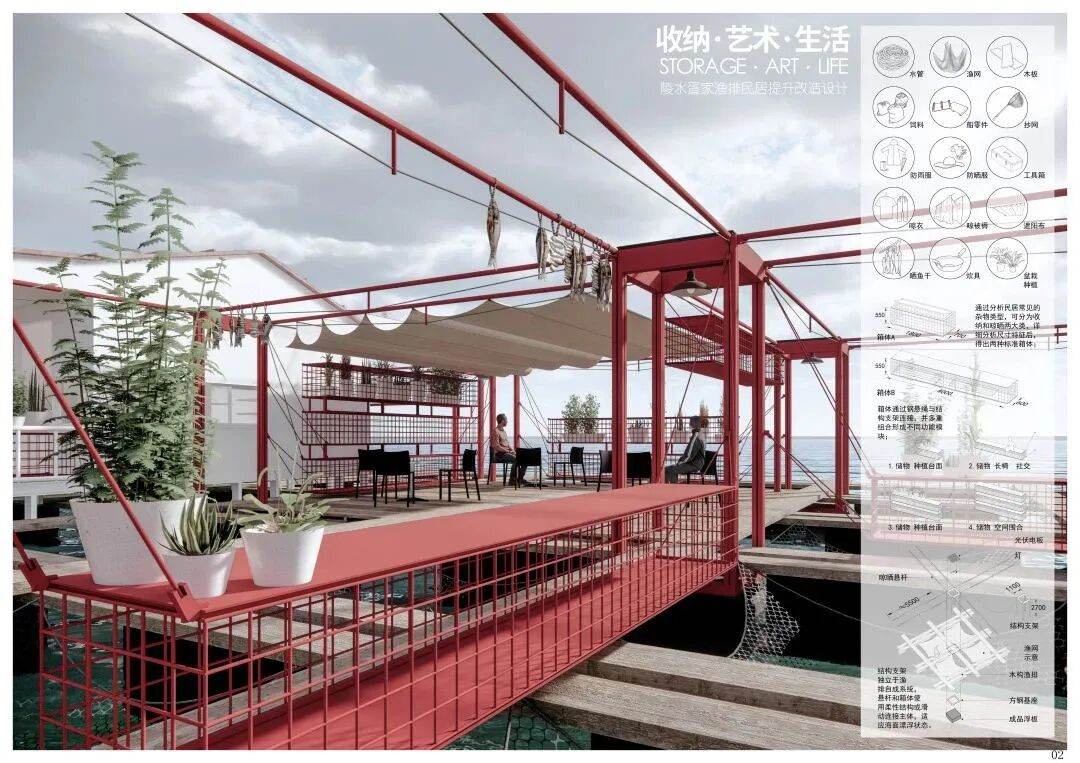 设计首先跟随渔排走向构建一层“抬升的网格”,利用其限定出的“透明的立界面”来放置悬挂箱体以及晾晒悬杆,实现收纳晾晒、休憩停坐、绿化种植等功能,还可根据实际情况变化不同空间组合;而方案的艺术性则体现在不加装饰的结构表达,以及将轻盈感做到极致外加色彩对比所产生的“小而美”之意境。