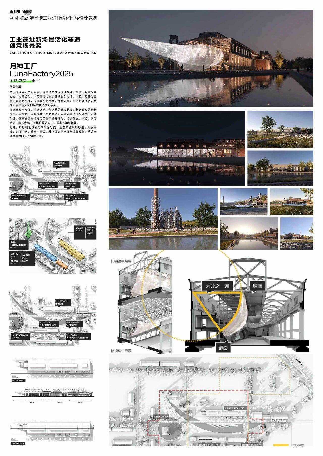 本次获奖作品《月神工厂》,以“月”作为核心意象,在自然的诗意与工业的理性之间构建共鸣。方案以“观月、追痕、沐光”三重空间叙事为线索,激活株洲清水塘片区,打造一个既具美学张力、又富复合功能的公共场域。
