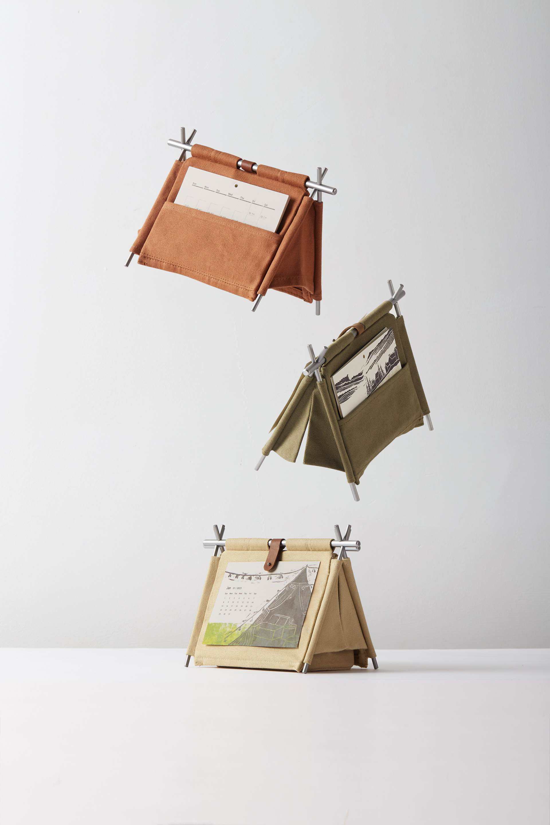 产品功能与体验:“帐篷台历” 能让用户足不出户享受在家搭建小帐篷的乐趣。包装盒内配有零件,用户可自行 DIY 拼成迷你帐篷。它兼具台历功能,打开帐篷后,内部隐藏布艺 “小抽屉”,可收纳文具;帐篷背面设有卡片收纳区域,能放置便签条、名片、小卡片等。用户既能体验 “搭帐篷” 的手工乐趣,又可将其放在办公桌上作为台历使用,具备记事功能,还能巧妙利用空间收纳文具和卡片,设计兼具趣味性、实用性与创意。