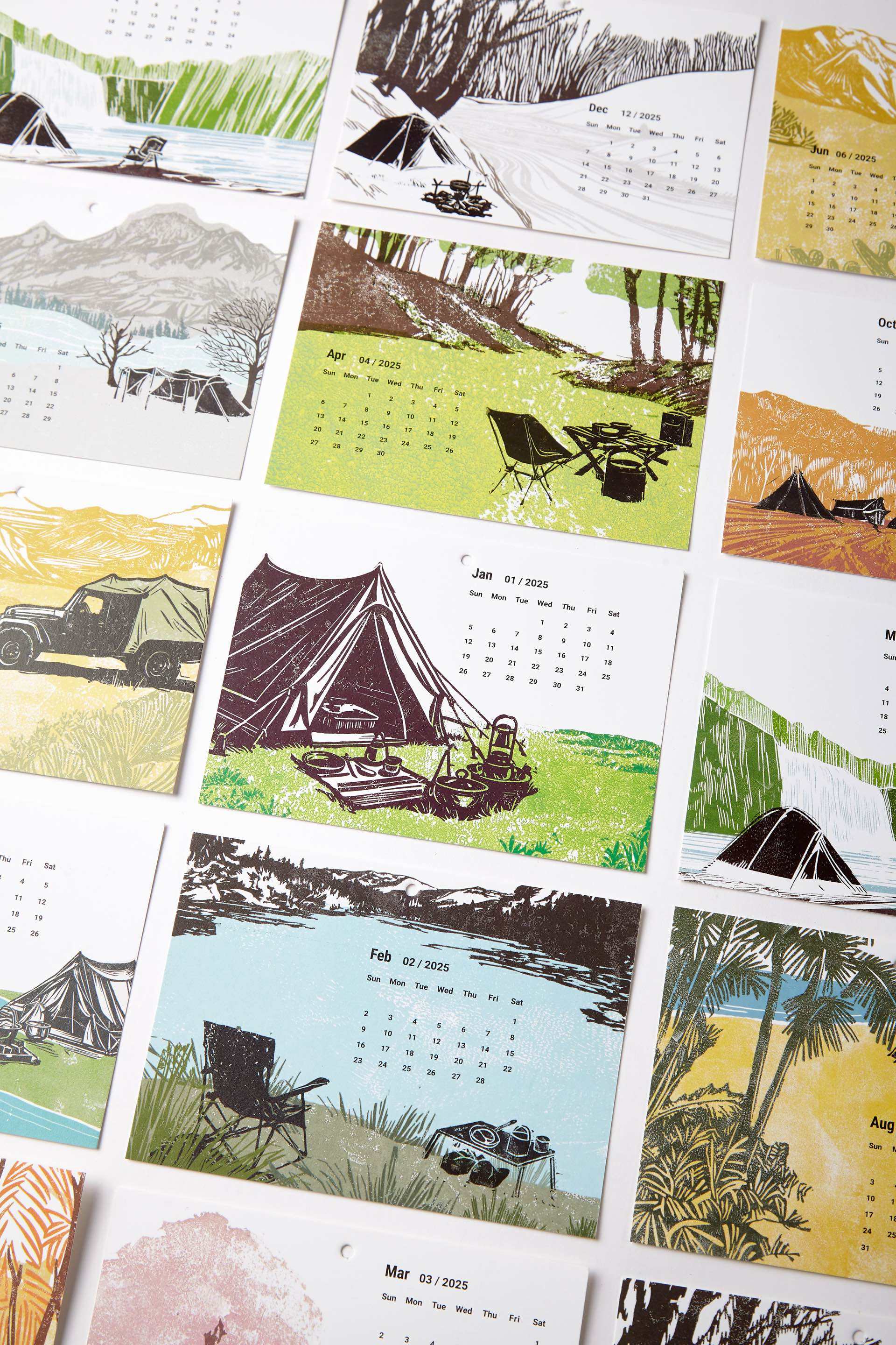 材料选择与工艺:材料上采用铝合金和帆布。设计师团队为让用户享受拼装乐趣且避免拼装过程过于复杂困难,不断研究探索,测试仅用四根直径较细、螺丝接口又小的铝合金杆件,确保其不易折断且能承受重力,经不懈努力与反复打磨最终实现产品落地。12 张台历卡片由传统刀刻版画手工制作,插画师采用国外流行的进口亚麻胶版创作,耗时数月,以匠人之心在雕刻版上用刻刀雕琢而成。每幅画拆分成多图层,每层手工精心拓印、多层叠印,制成 12 张色彩靓丽的插画。插画结合写实手法,刻画温馨有趣的露营场景,展现一年四季户外露营生活的点滴。