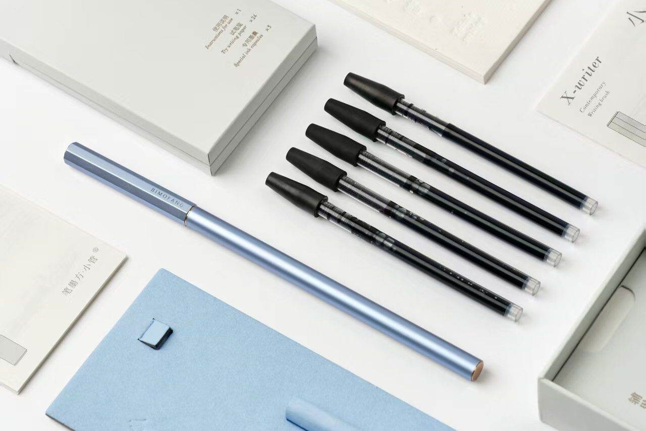 “笔墨方”是慢物质造物平台打造的现代文房品牌。随着中国互联网的普及,年轻人之间正在引发一轮新时代的毛笔书写浪潮,在此背景下,传统毛笔需要全面改革,以更符合当代使用者的需求。因此,笔墨方团队联合中国著名制笔手艺人李小平先生共同研发小管现代毛笔,传统手艺结合现代科技,开创性设计了全新的毛笔结构。