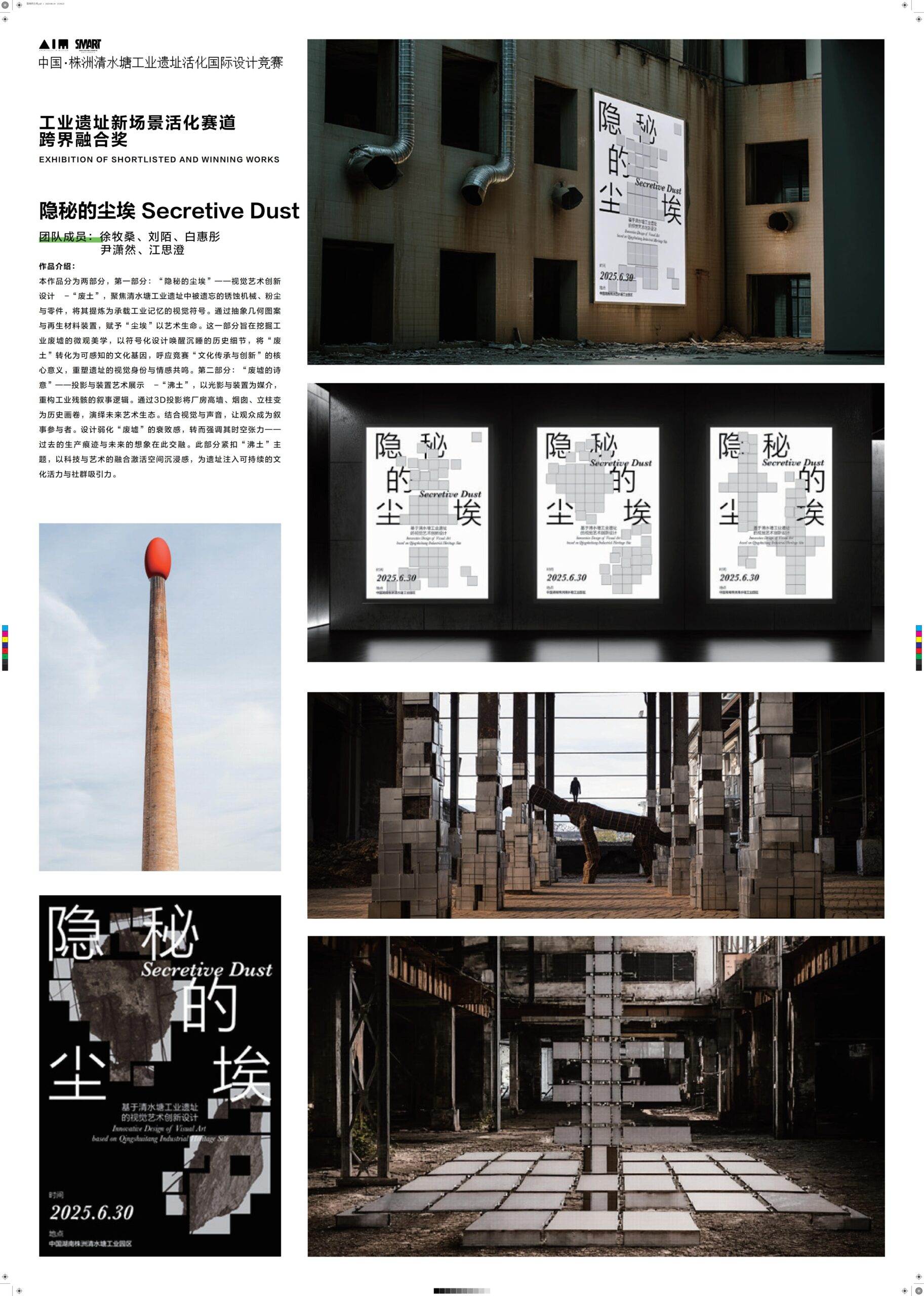 “隐秘的尘埃” 基于清水塘工业遗址,分 “废土” 与 “沸土” 两部分,前者将锈蚀机械等转化为视觉符号留存记忆,后者借光影与装置激活遗址活力,让观众参与叙事。作品以方形为核心视觉元素,通过重构工业遗痕与科技艺术融合,实现历史记忆与未来想象的交融。
