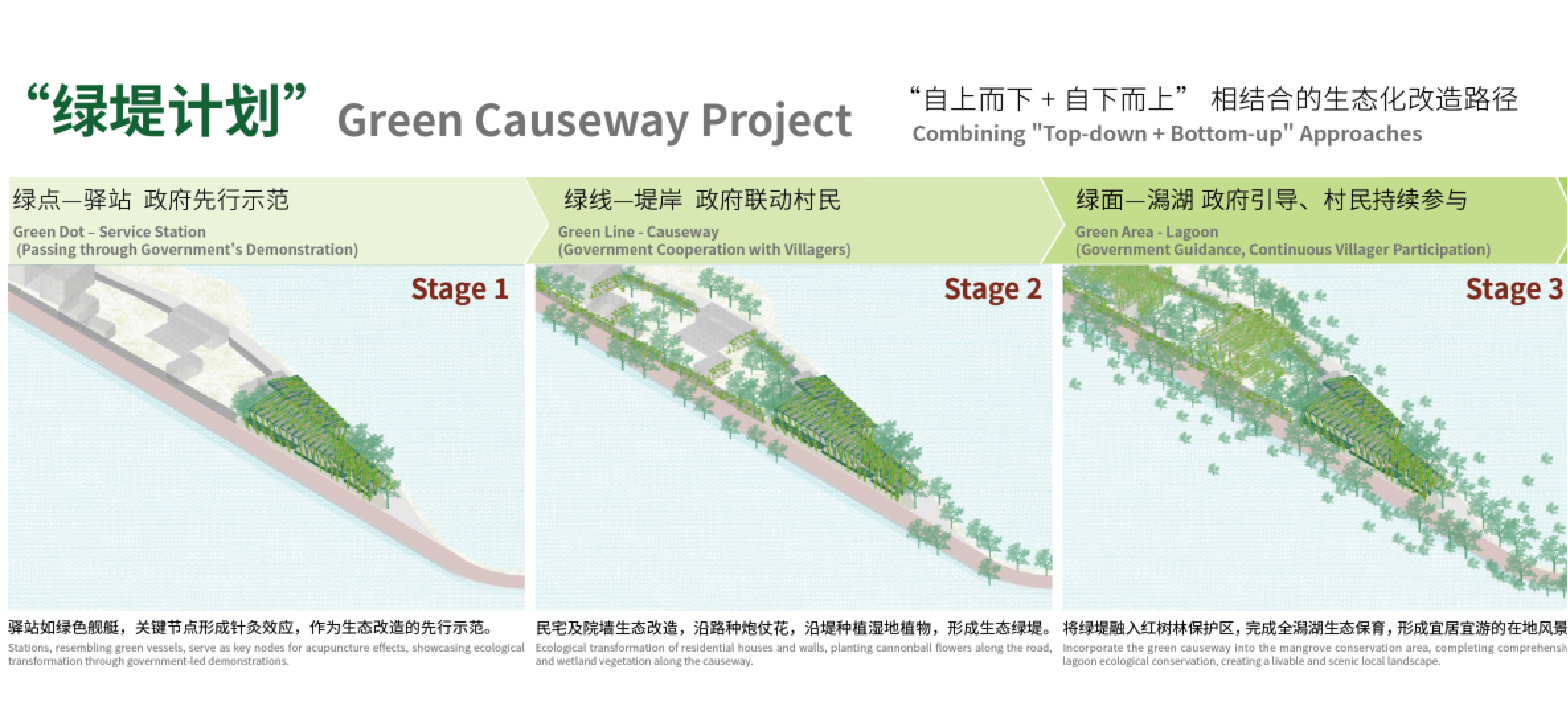 “绿堤计划”是“自上而下+自下而上”相结合的生态化改造路径,政府带头,村民参与,通过点状针灸实现全域推广。