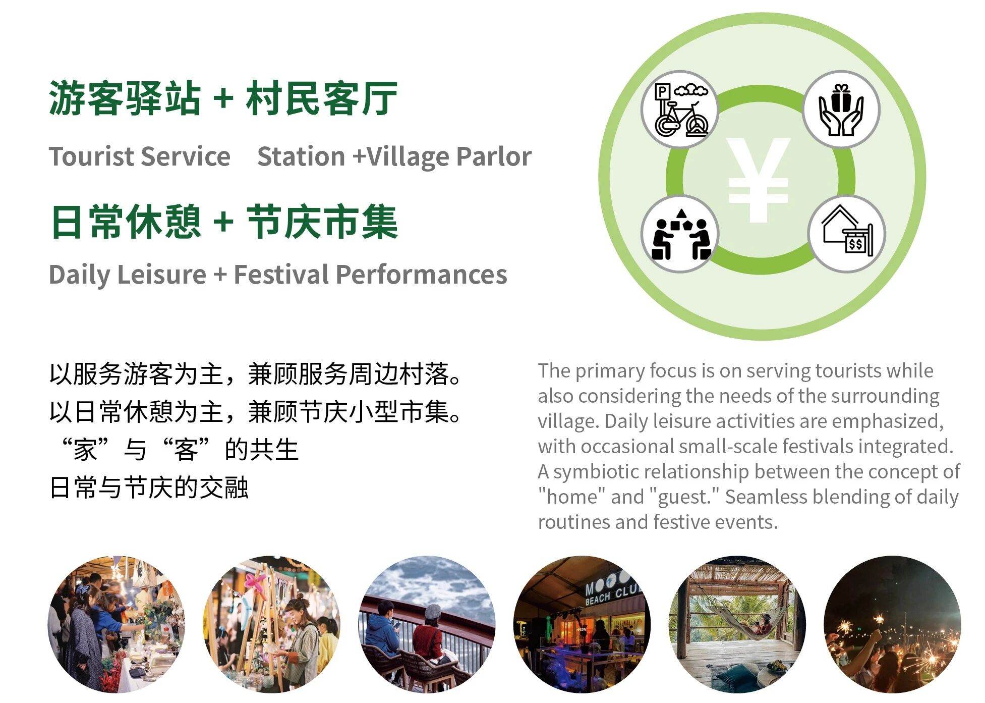 “家”与“客”的共生,日常与节庆的交融,打造的是游客驿站+村民客厅与日常休憩+节庆市集相结合的商业模式。