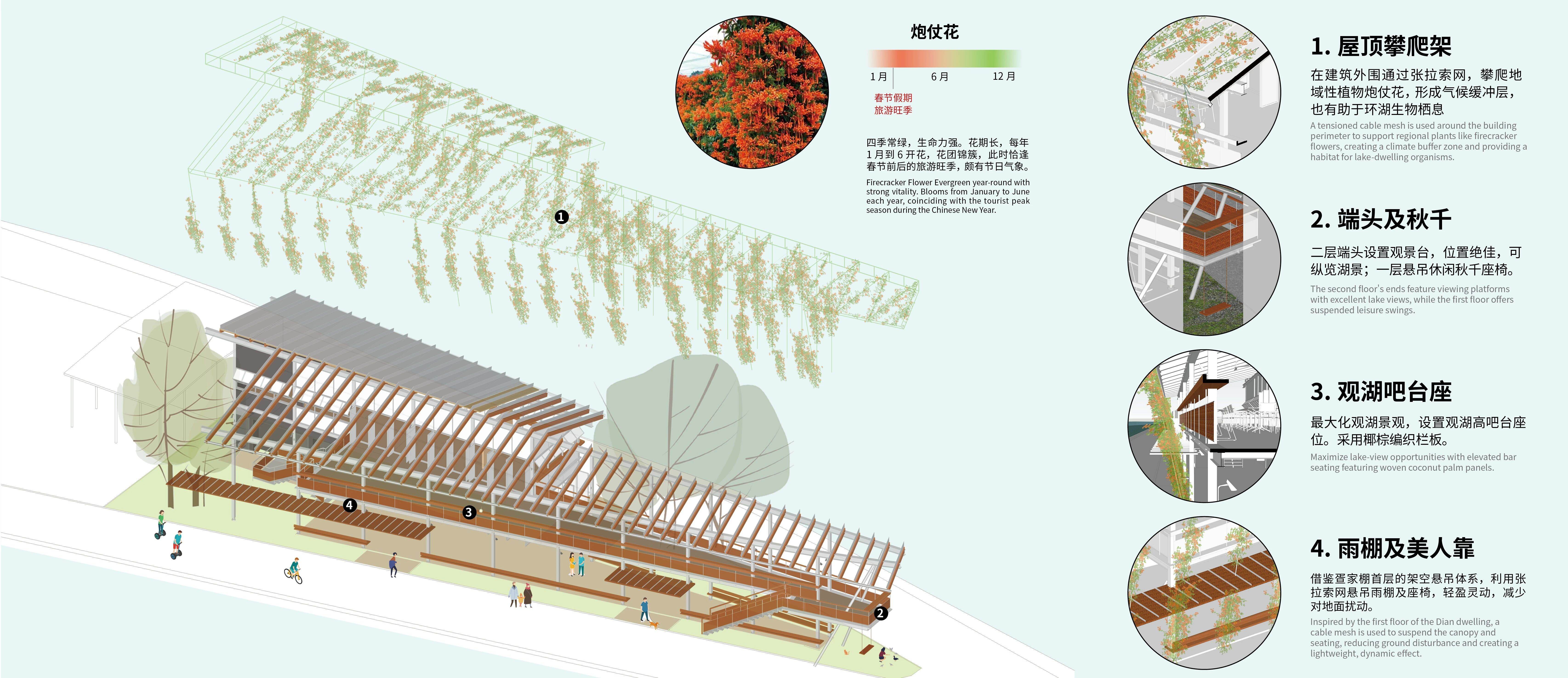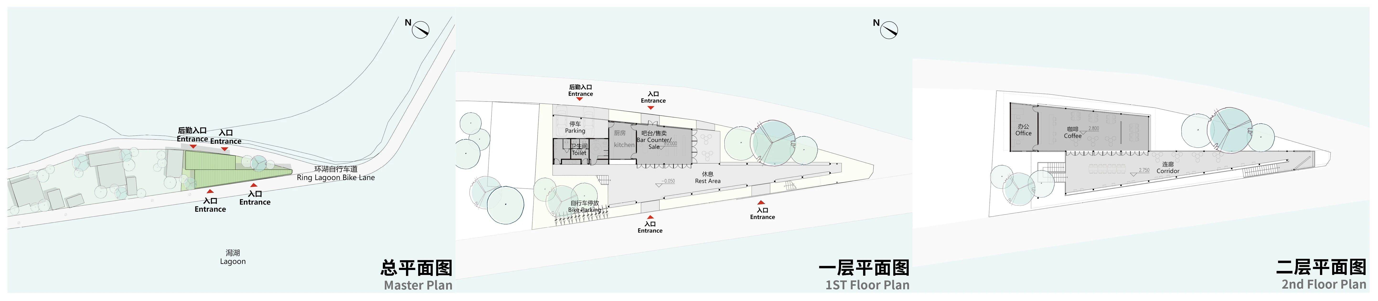 潟湖绿堤以通透的界面朝向湖面,与场地特征相契合,具备高度的完整性和出色的落地性。